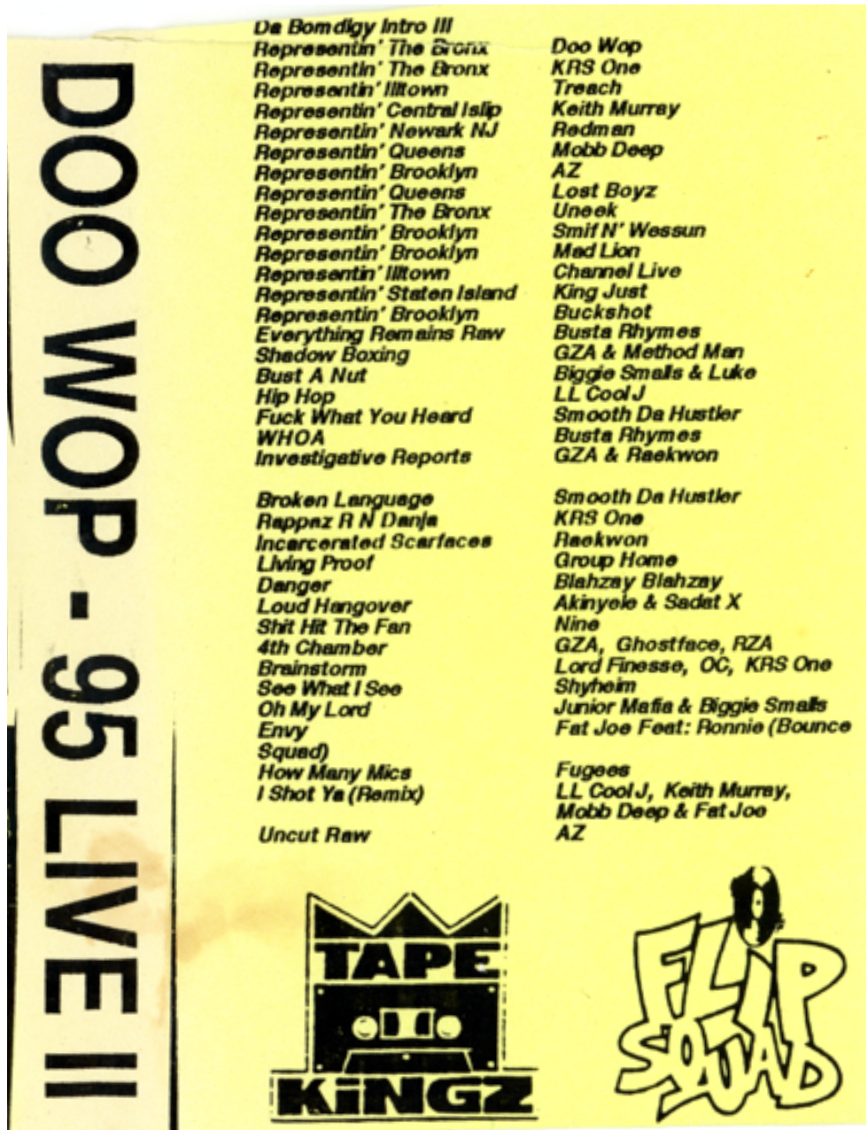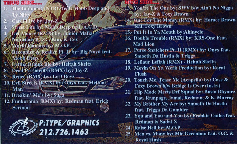 “Much apologies goes out to Stretch Armstrong and Doo Wop for not putting the freestyles on the tape and PHD for not putting your song on the tape but as you can see by the playlist, Mobb Deep got mad songs and I had to shorten and eliminate songs to make this tape possible.”
